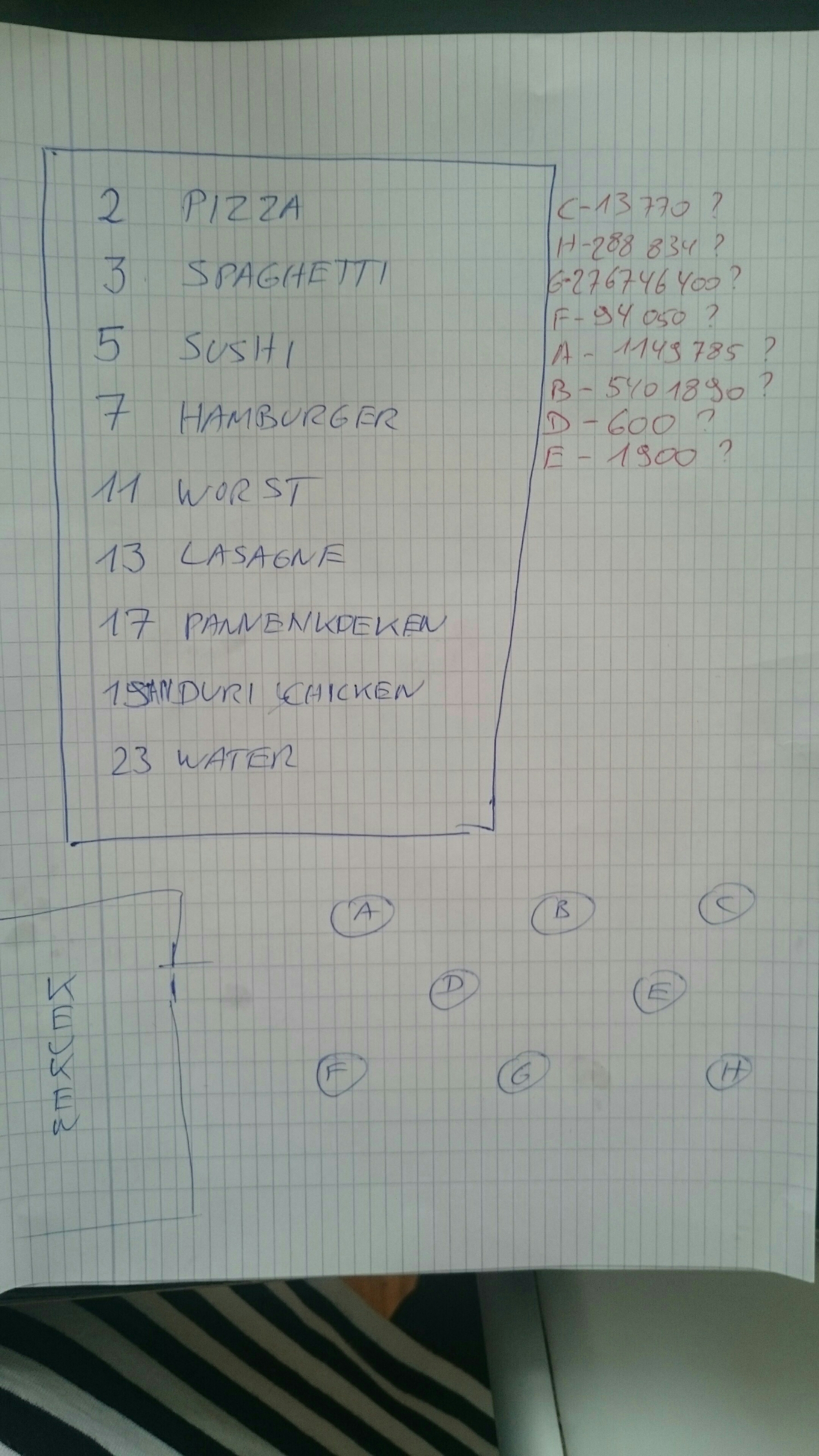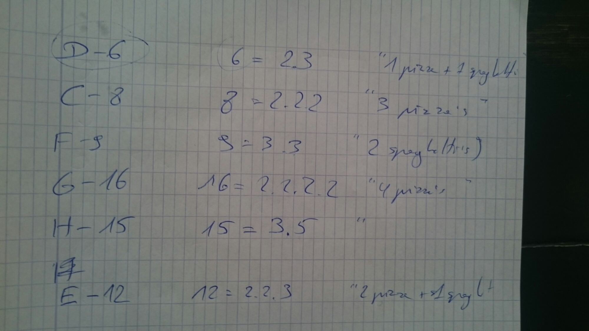 One more fun task from our maths tutor: expanding numbers into factors. Each dish on the menu has a number – always a prime number. The restaurant tables are marked with letters. if the water yells: “D-6!” it means the people at table D ordered one pizza and one spaghetti. (If you expand 6 into factors you get 2 x 3).
