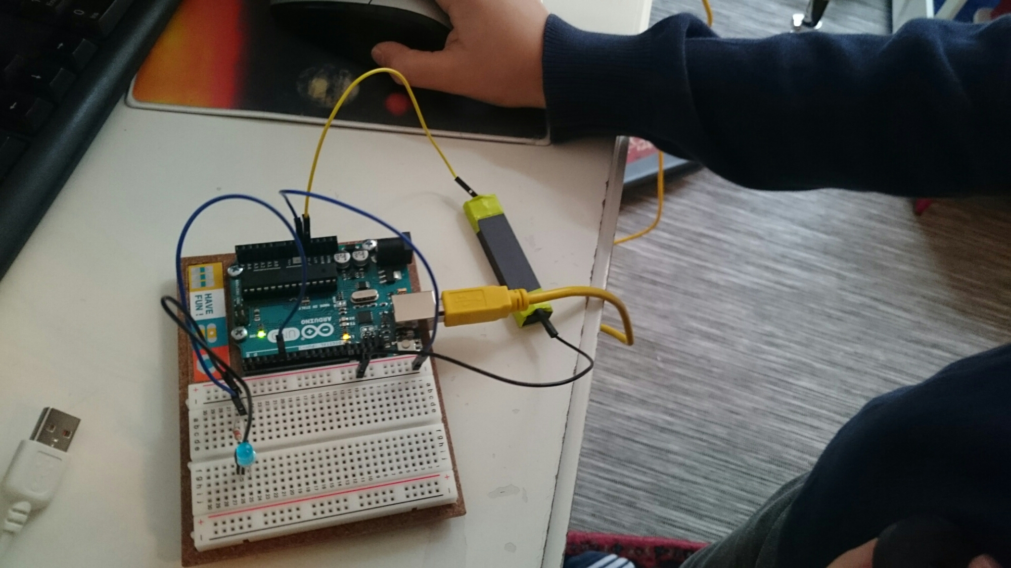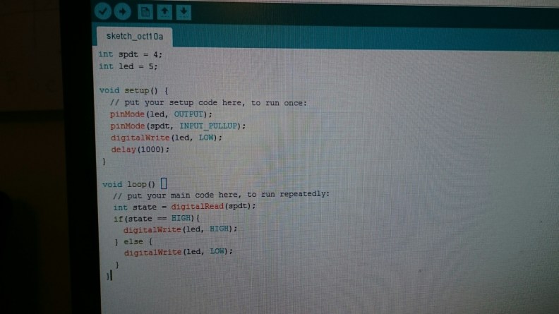 Simon was trying to program his Arduino board to use a magnetic switch to turn an LED on and off, but the code didn’t work. The LED was burning no matter what we did to the wiring leading to the magnet.