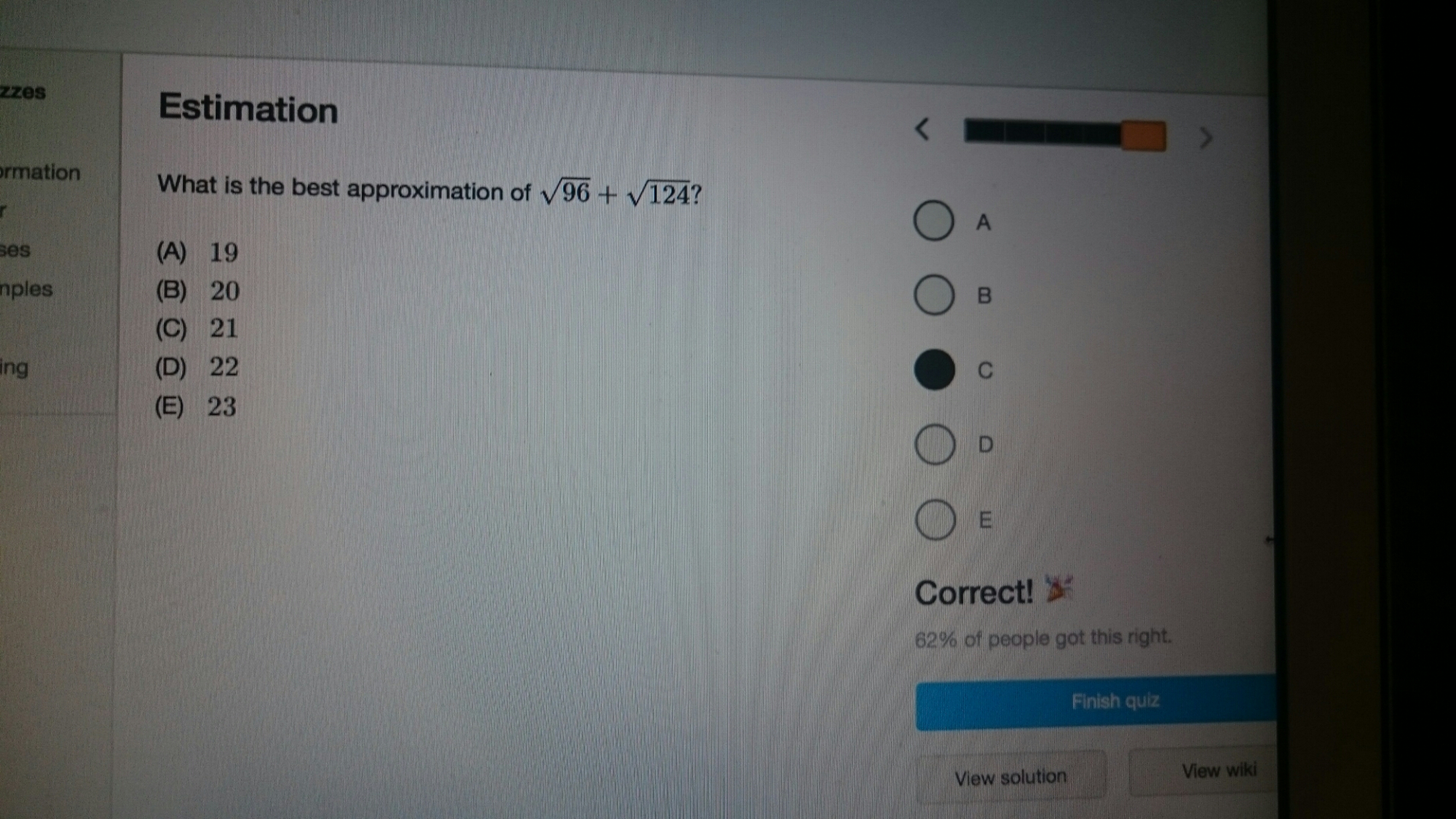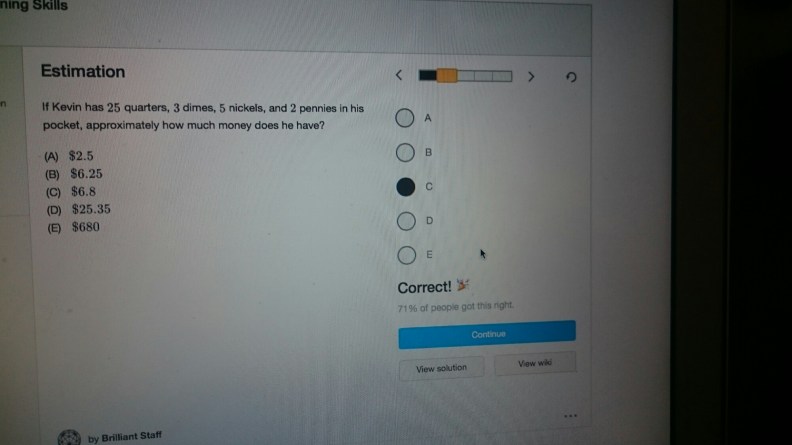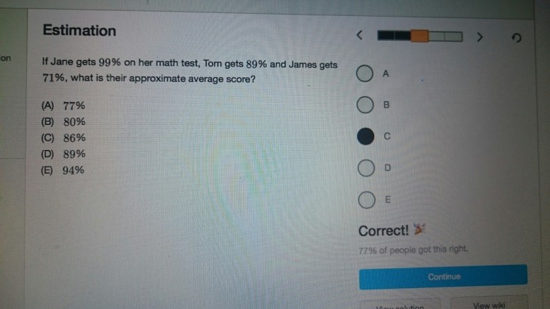 We decided to go back to the wonderful Brilliant.org for our math practices. Did the Estimations quiz yesterday: https://brilliant.org/practice/sat-estimation/?p=1