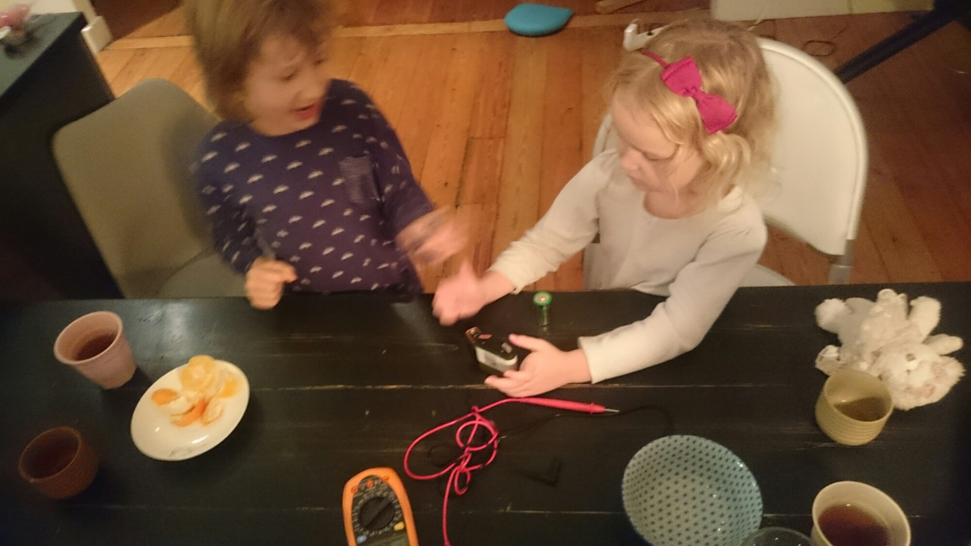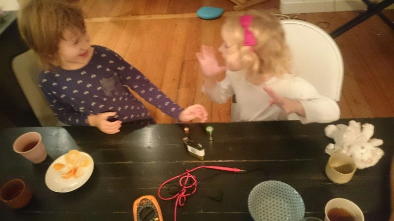 It’s late in the evening. While drinking his bedtime tea Simon is teaching his little sister to measure the voltage of various batteries.
