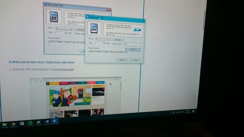 It was Simon’s idea to reimage the corrupted SD-card, he tried doing it himself the morning after the crash. He downloaded Noobs and Raspbian from RaspberryPi’s website but couldn’t go any further. The desktop said the files were “damaged”. As it turned out later, they were zipped and the desktop simply had no space on the hard drive to unzip them. But that was a good thing Simon stopped there as he didn’t know he should format the SD-card first, before uploading the new OS.