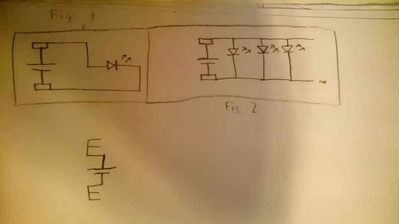 These are the circuits Simon was drawing for himself during the math lesson on Monday to help himself understand the topic better. It is an illustration of the Lily Pad Design kit, a wearable including conductive thread and sew-on LEDs: