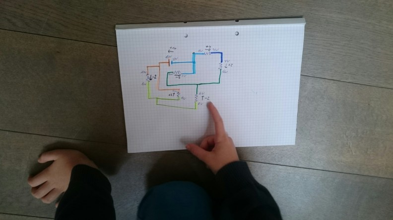On Monday Simon’s math tutor and I agreed that Simon should try some problem solving involving both math and electricity, considering his current interest. We chose Electricity and Magnetism > Current Behaviour > Kirchoff’s Current Law on Brilliant.org. I must say it wasn’t easy, but Simon said he understood it. We weren’t sure about that until Wednesday afternoon, when Simon discovered a new Adventures in Science video on YouTube on series and parallel circuits and screamed: “Mom, but that’s just Kirchoff’s Law!” and drew beautiful schematics.