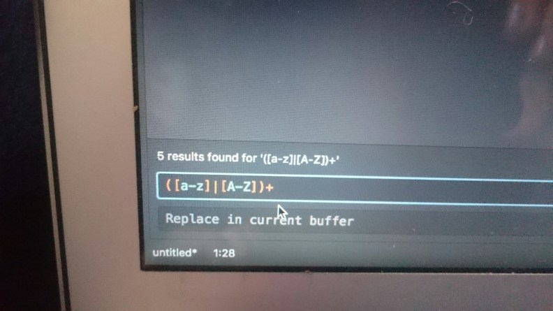 In the following example Simon is looking for one or more concatenated lower case or upper case letters (the pipe stands for the logic OR and combining this logic OR with parentheses means alternation). “In this case, I’ve combined alternation with character classes”, Simon adds: