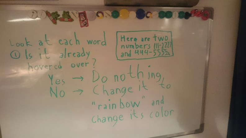 The JavaScript Word Interactor changes word details (colour, background colour, text). The Word Counter counts how often a word appears in a text. Simon learned about Word Interactor and Word Counter from Daniel Shiffman’s Coding Challenges 38 and 40.1-40.3