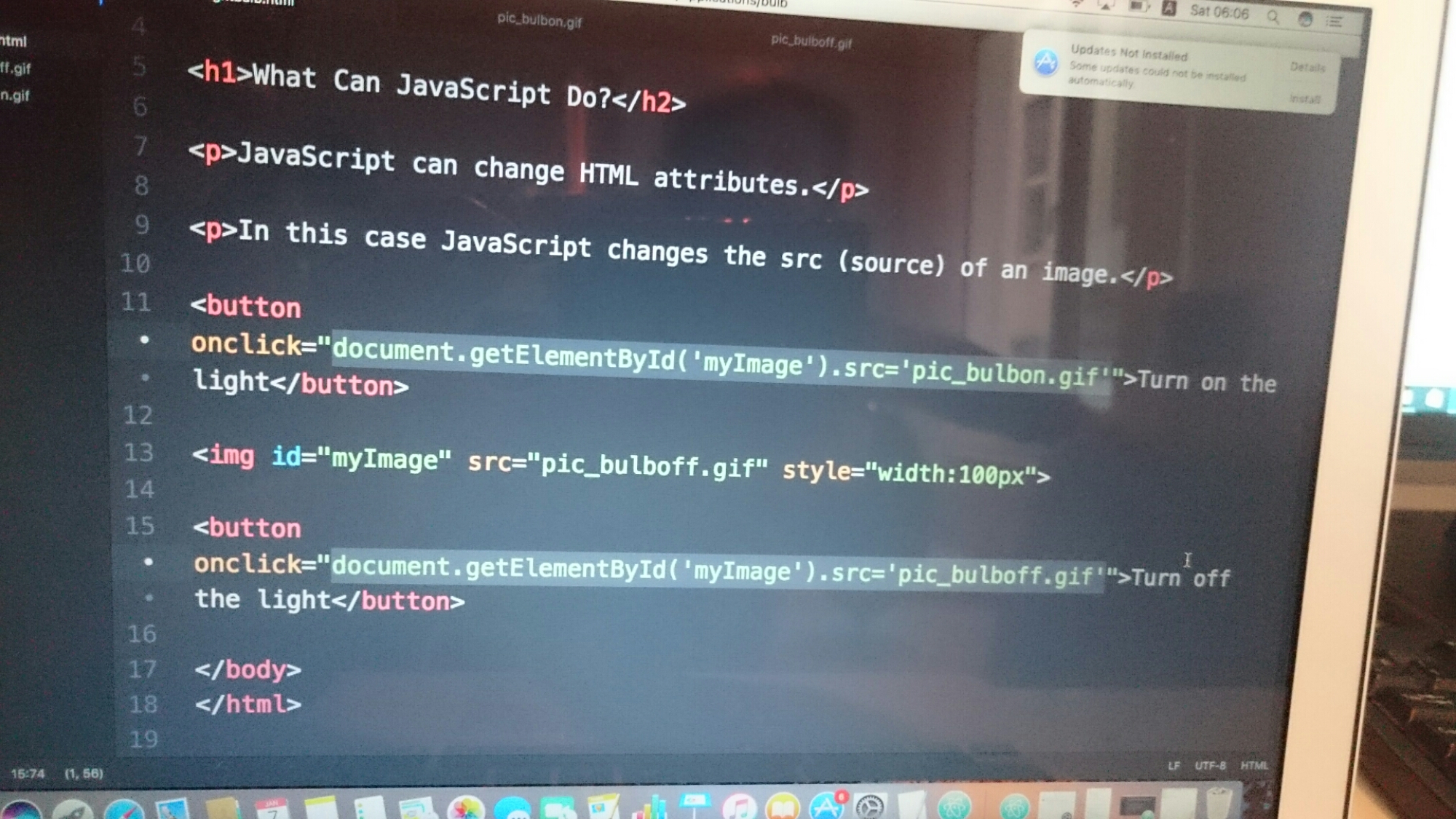 By Geeks out of the Box Posted on January 11, 2017January 12, 2017 JavaScript can change HTML attributes This weekend Simon experimented with how JavaScript can change HTML attributes (something he earned from w3schools): Share this:TweetLike Loading... Related