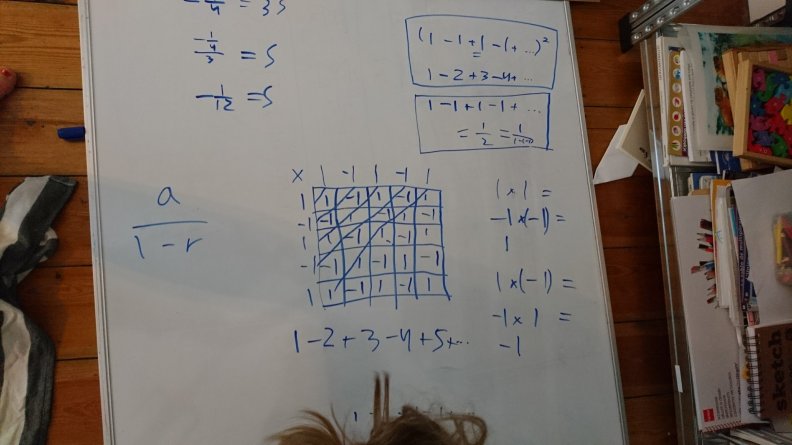 Simon keeps coming back to this irresistible math problem about whether the infinite sum 1 + 2 + 3 + 4 +… converges to negative 1/12. He was quite disappointed to hear Mathologer explain that it’s highly contraversial and that many mathematicians don’t believe in the negative 1/12 solution, at least not as long as they use the “equal” sign. Then, about a week later, on May 7 he suddenly told me he is now completely convinced that “Numberphile’s proof (that 1 + 2 +3 + 4 +… does converge to -1/12) breaks math!”