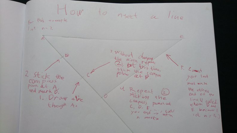 Simon’s little textbook on how to bisect and “n-sect” a line, that he wrote himself: