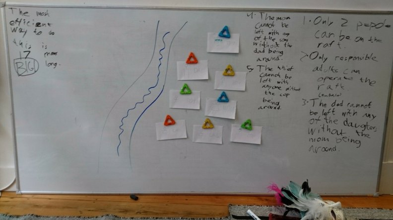Simon showing the classic River Crossings puzzle to friends