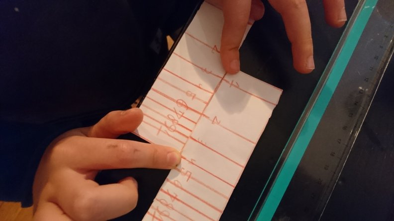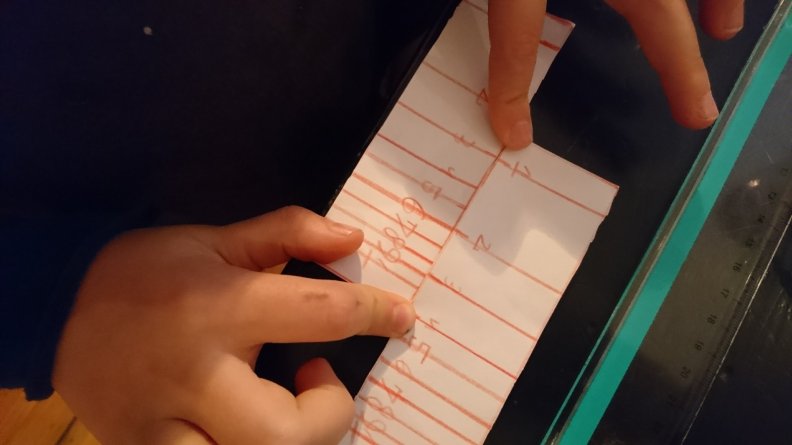 Simon has crafted his own tiny slide rule that he carries around rolled up in an elastic band and calls his “toy”. The two strips of paper aligned together in certain ways can give answers to multiplication and division problems. Simon distributed the numbers on them according to a logarithmic scale.