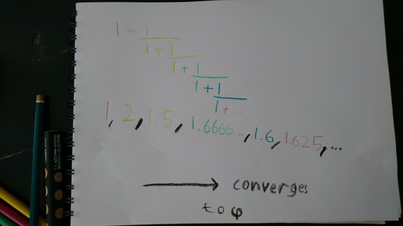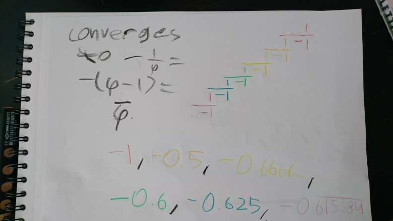 Sequences converging to Phi and negative one over Phi. Both are the only solutions to the quadratic equation that Simon used earlier to prove that Phi is not a transcendental number.