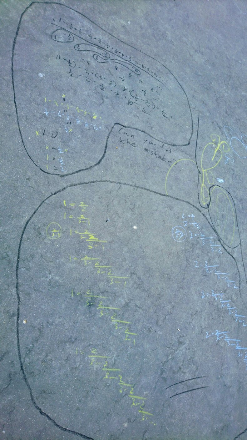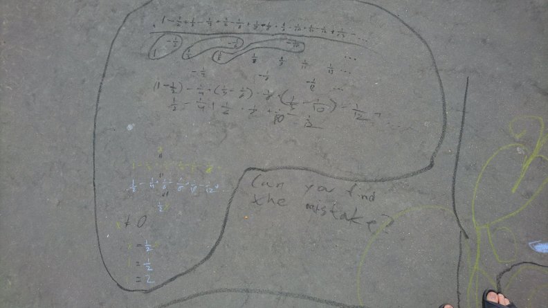 Simon shows two examples of a false proof, using infinite fractions and infinite sums. The mistake in proof no. 1 is that when using an infinite fraction one can not count from the bottom (as there is no bottom). The mistake in proof no.2 is that one cannot change the sequence of terms in an infinite sum (while that would not affect the result in a finite sum).