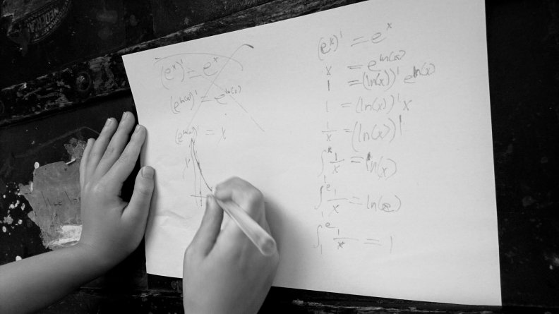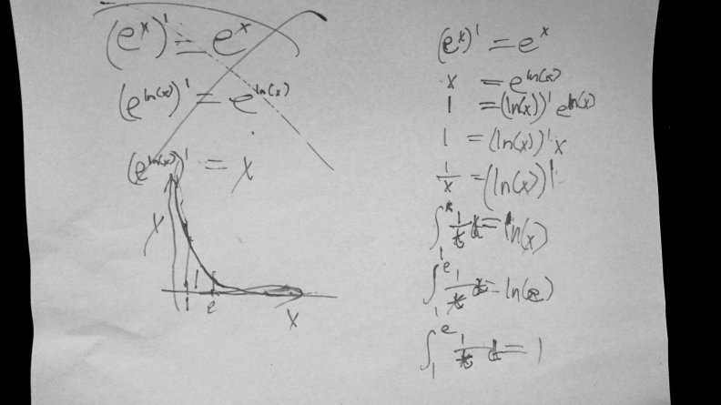 The idea comes from a video by Mathologer. Simon sketches a geometric definition of the Euler’s number (e) using integrals. He messed up a little with the integral notation, but corrected it later (after we stopped filming). Please see the photos below: