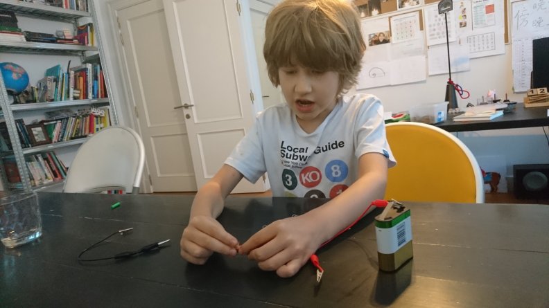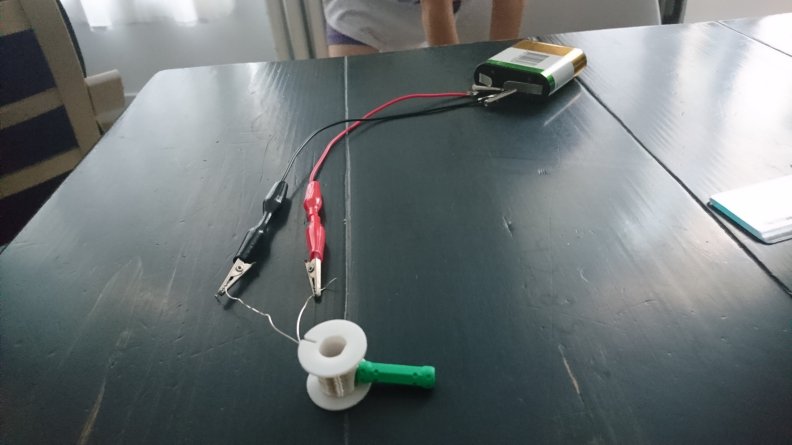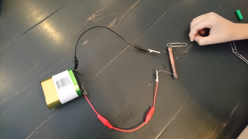 Here Simon tried to induce a magnetic field by allowing electric current to go through a conductor that is normally not magnetic (copper wire). The green stick is a magnet that got attracted to it once the circuit closed.