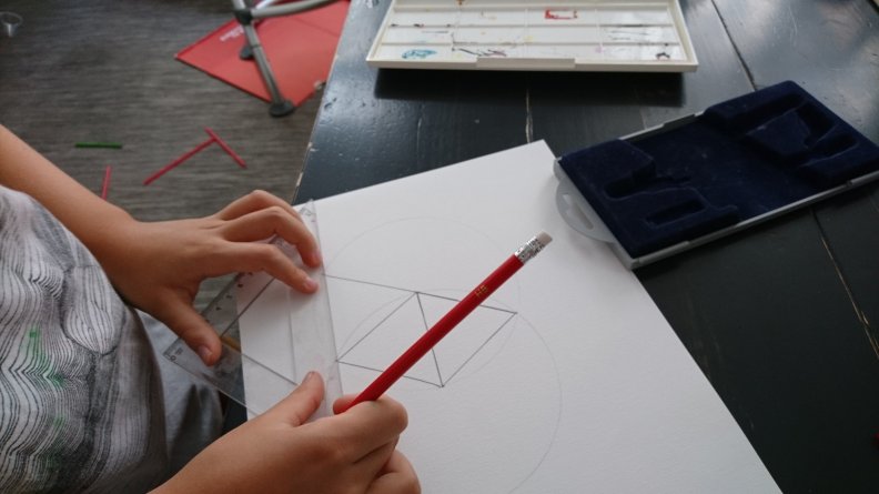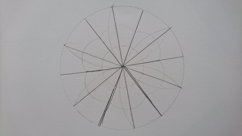 Making the fourth disk was the most difficult part as Simon wanted to divide the circle into 12 equal sectors. He came up with this elegant solution: he drew a hexagon and then bisected every angle (see below).