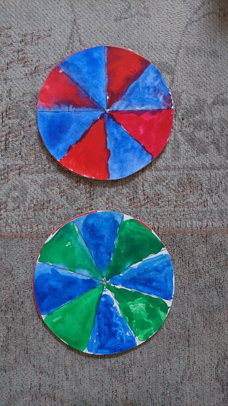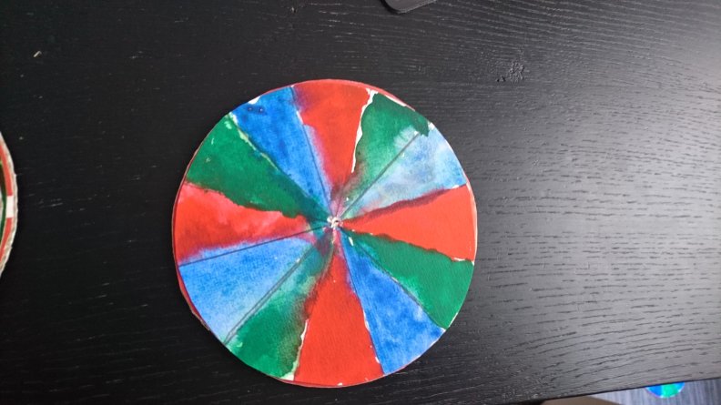 Inspired by Physics Girl, here come a couple crafty color wheel experiments involving what Physics Girl calls “mind blending” (it may not be the real name) – mixing color wave lengths in your mind. Simon has already studied the way our brain perceives blended/ moving color before, in the several optical illusions he programmed. This time, however, he decided to observe how simple paint can produce the same effect.