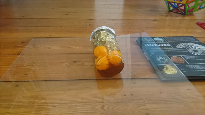 Caution: this is not a dessert, but ping-pong balls dumped in honey. Yes, we had to shop for a lot of honey yesterday to let Simon do the trick. It’s about a bottle rolling down a slope and stopping on the way, and rolling again. The viscous honey makes the balls super slow, this us why the bottle has uneven/unstable weight on each side. We didn’t quite succeed. The bottle did stop, but did not quite resume its motion down the slope. On other occasions it did roll well, but didn’t stop. We also tried a different bottle and a longer slope (ironing board). Perhaps, the slope still wasn’t long enough or the balls needed even more space inside the bottle?