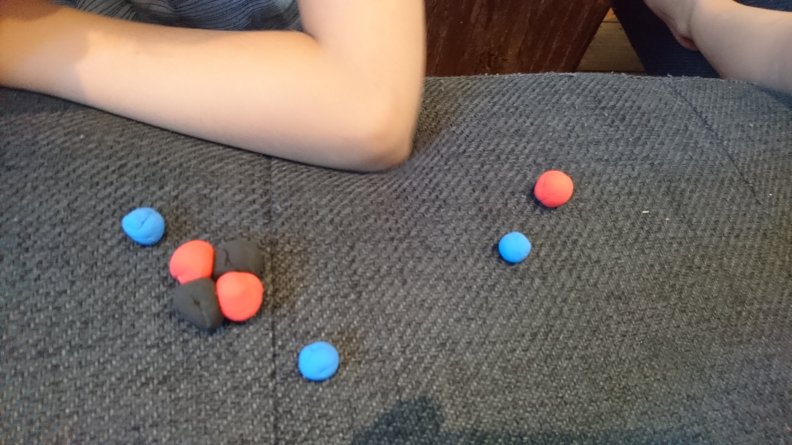 Making atom models from clay together with sis. The blue clay balls are electrons and the red ones are protons.