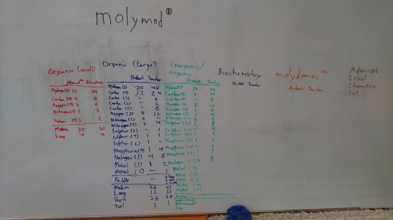 Simon is seriously enjoying his new Molymod chemistry modeling sets and has been obsessing about which set contains what atoms and bonds.