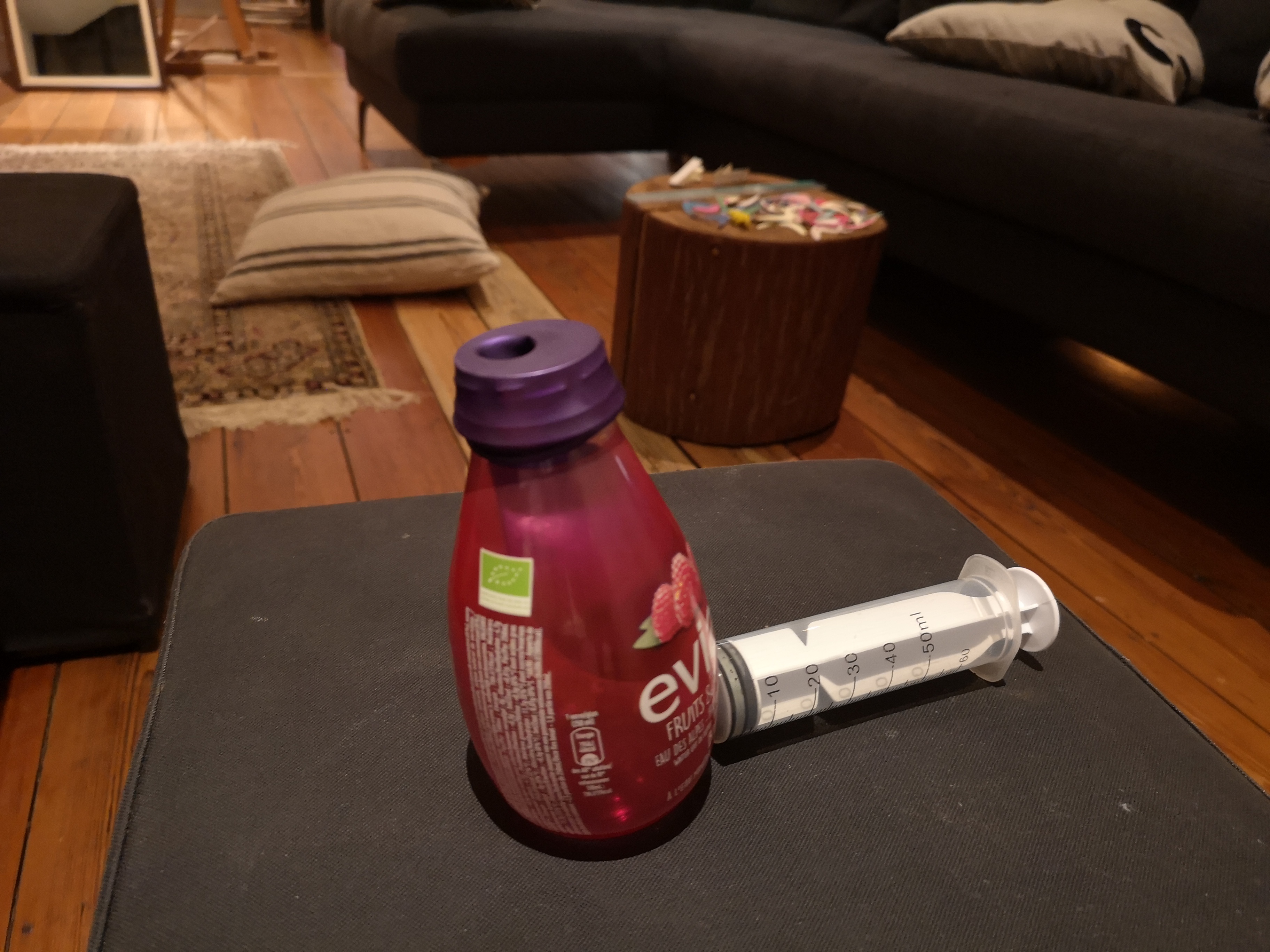 The syringe (pictured below) inserted into the hole acts as the diaphragm: when you pull on the syringe to suck the air from the bottle (create vacuum inside the bottle), the balloon (the lung) blows up, filling itself with air that comes through the bottle’s opening.
