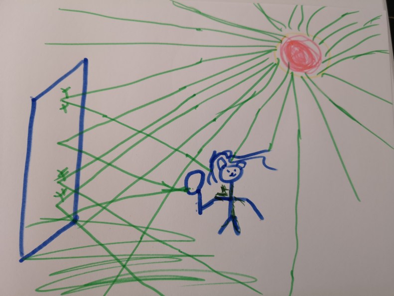 We were reading Steven Hawking’s A Brief History of Time, and Simon asked: “If the speed of light is the same relative to any body, is it the same relative to other light? How fast is light relative to itself? Is it stationary or does it have the speed of light?” We tried to imagine what it feels like to be a ray of light. Simon thinks that to light (or to a photon), time doesn’t exist. Does that mean that to light (to a photon), there is no causality? (Like a photon doesn’t know what happened first and what happened later – whether it first left the star Betelgeuse (640 light years away from the Earth) and then reached the Earth or the other way around?