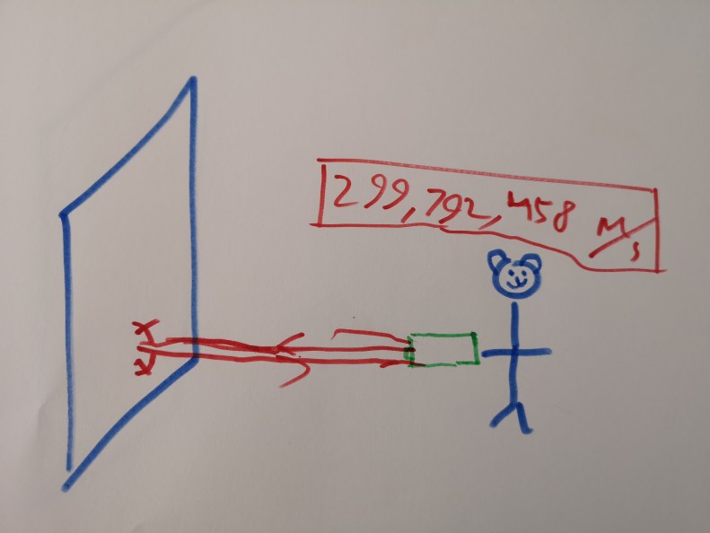 Another observation from two days ago: Simon says that the tunnel appearing in the mirror once two mirrors are placed opposite to each other grows linearly with respect to time but always remains finite. Within one second, if you stand 1m away from the mirror, you will get 299 792 458 mirrors in your tunnel (because that’s how many times light will travel back and force during one second) or 149 896229 (half the previous number) small mirrors reflected in the large mirror:
