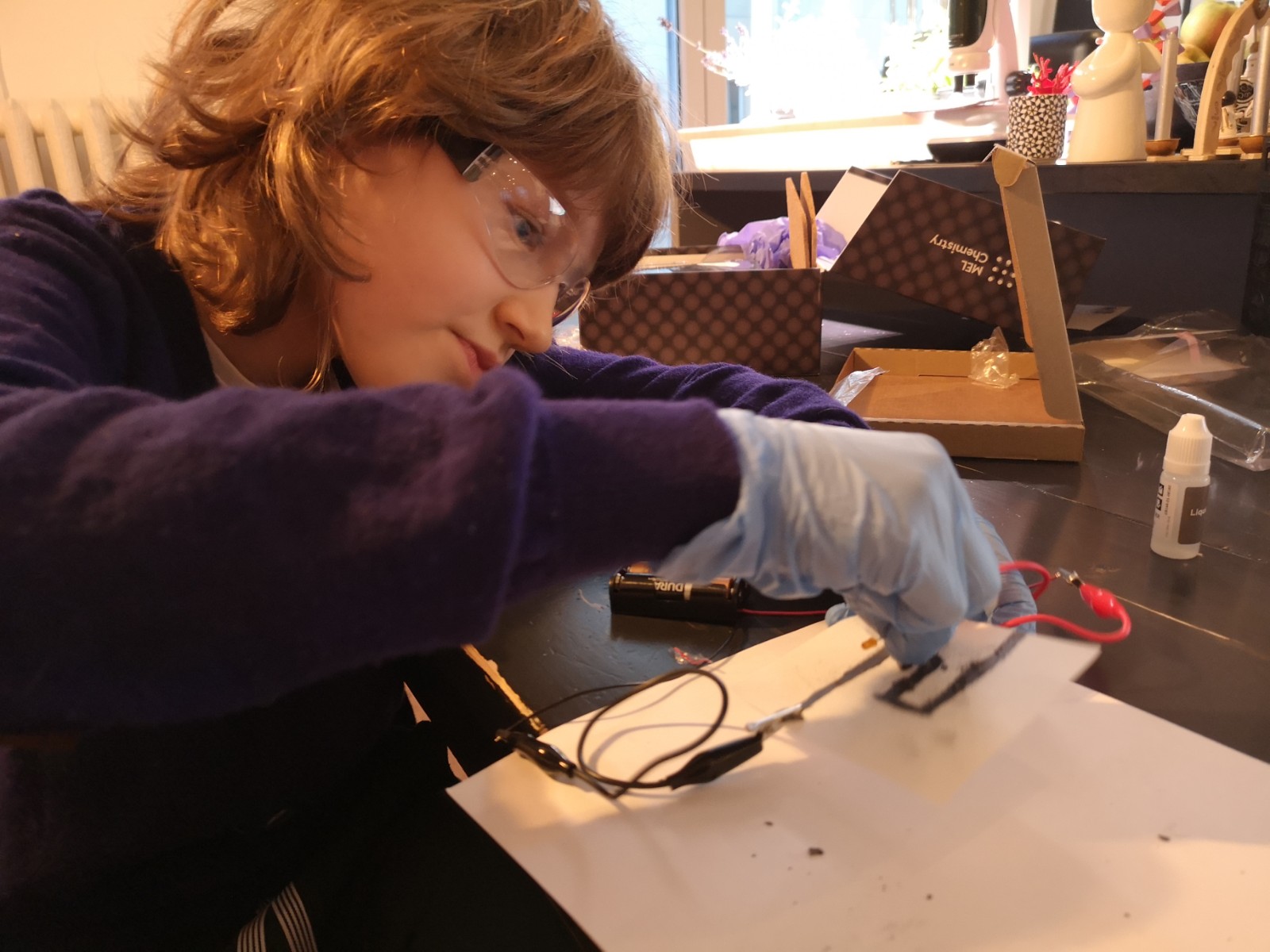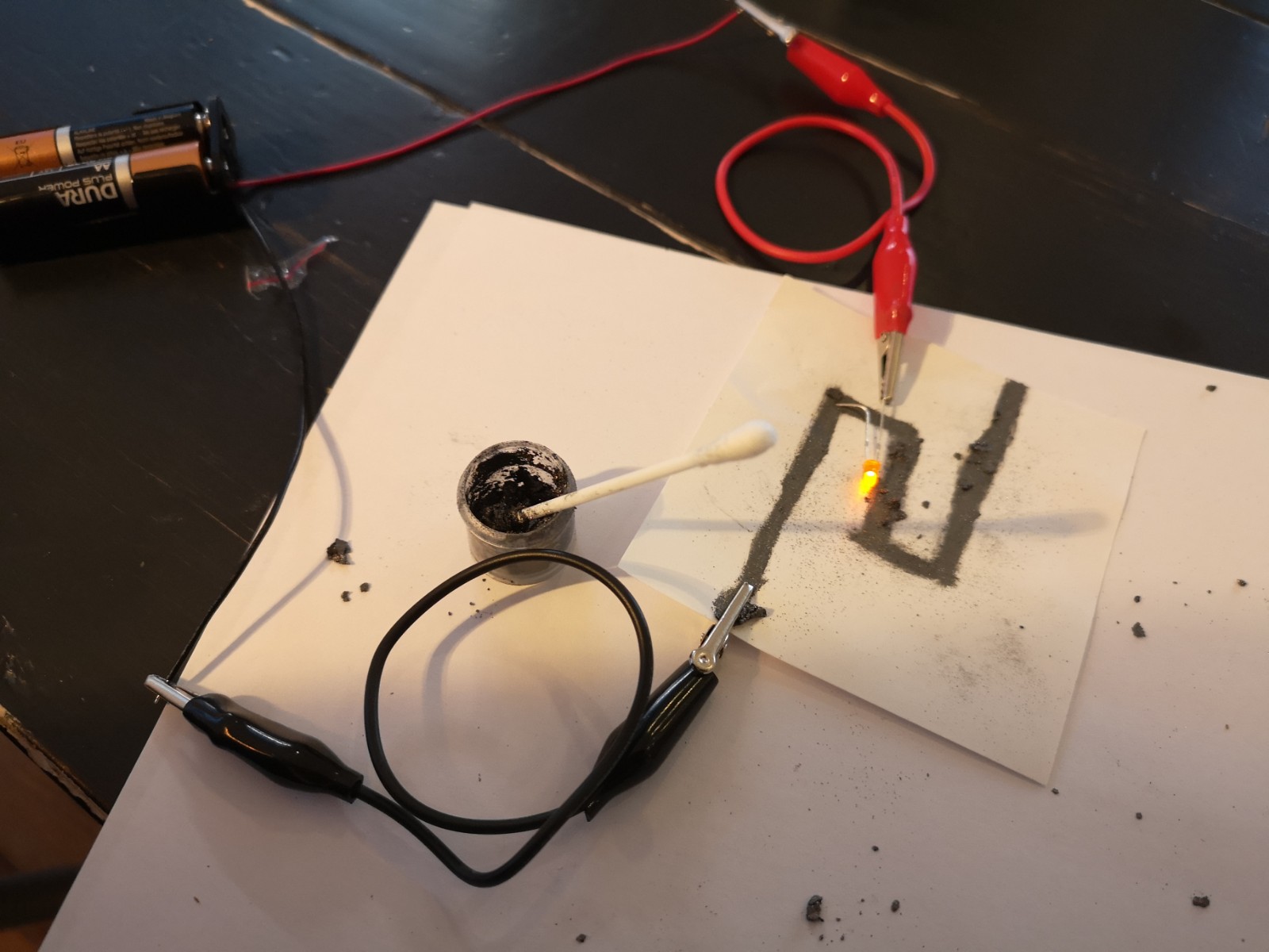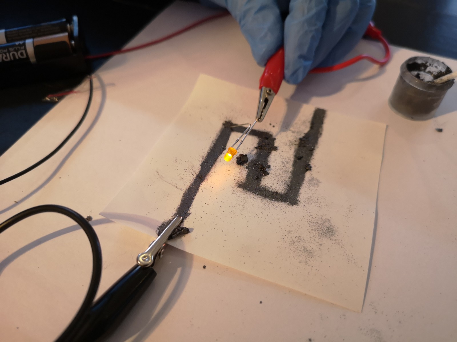We did two more experiments a couple days ago: Liquid Wires (creating a simple circuit using graphite and liquid glass, a sodium silicate solution) and making our own Zinc-Carbon Battery, a chemical source of electric current that relies on an oxidation-reduction (redox) reaction between manganese dioxide (MnO2) and zinc (Zn).