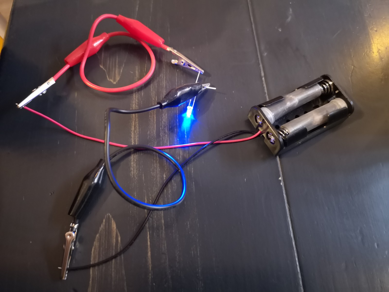 Our battery is divided into two sections, separated by wadding: one section holds the oxidizer MnO2 and the other contains the reductant Zn. When the crocodile clips are connected to a diode, the circuit is closed and the reaction can begin: electrons start migrating from the zinc section to the manganese section (manganese dioxide mixed with graphite o make it a better conductor). We used ammonium chloride NH4Cl as the electrolyte.