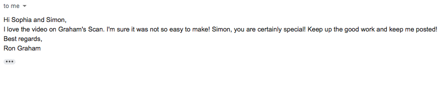 “Hi Sophia and Simon, I love the video on Graham’s Scan. I’m sure it was not so easy to make! Simon, you are certainly special! Keep up the good work and keep me posted! Best regards, Ron Graham”