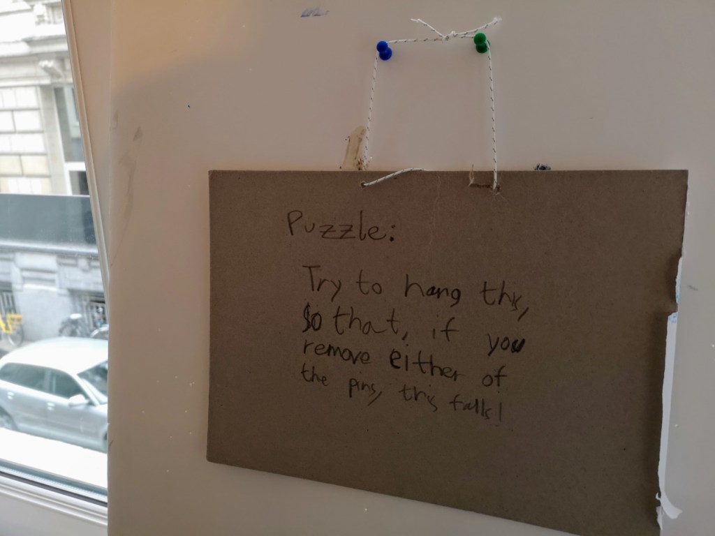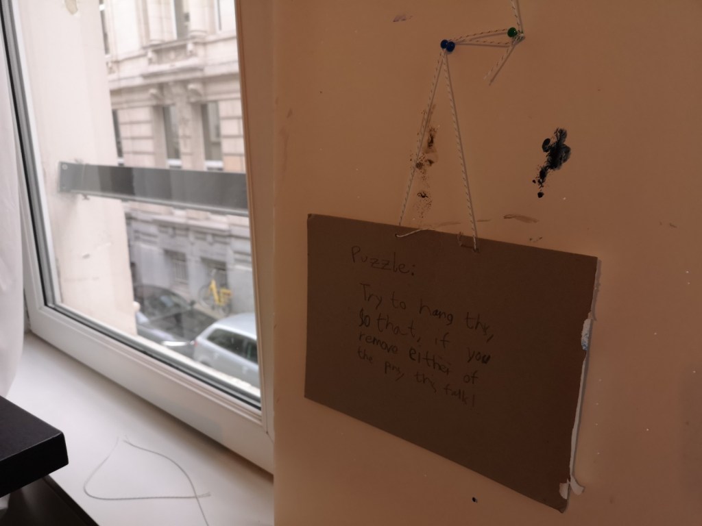But the puzzle asks us to think of a configuration that makes the poster fall once ANY pin is removed, doesn’t matter which! And that’s way more difficult. Simon said that we should simplify the problem by removing the poster altogether and replacing the pins with two small loops of string.