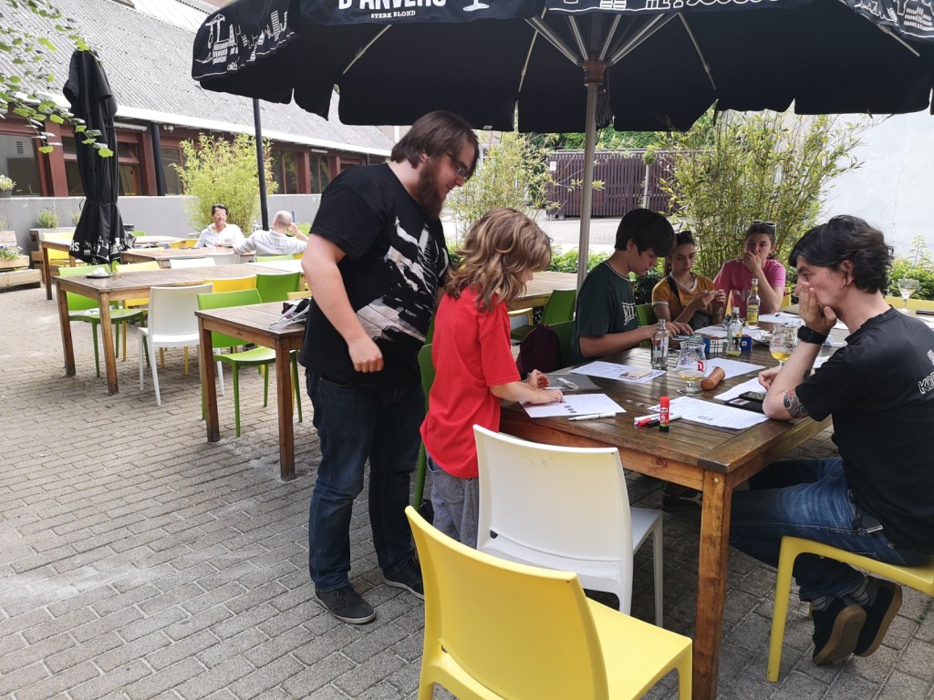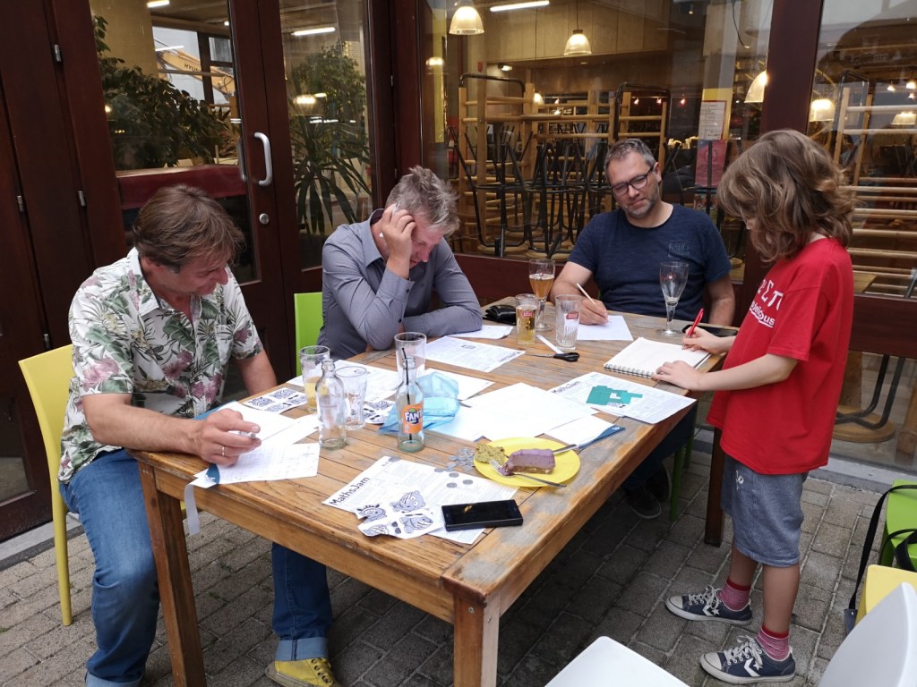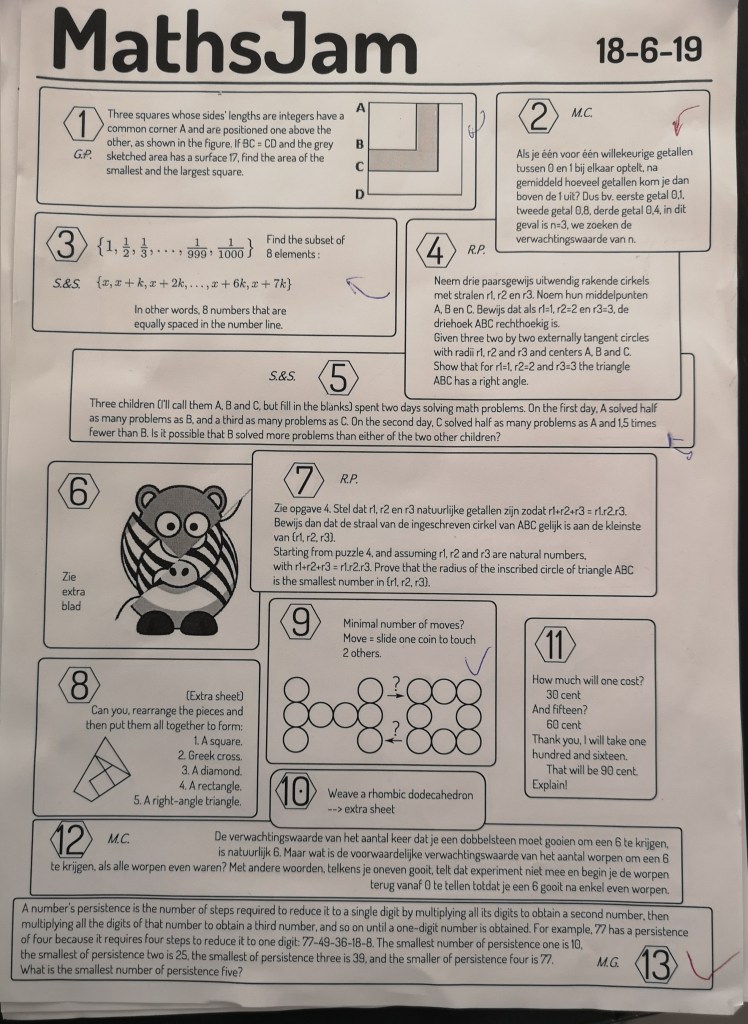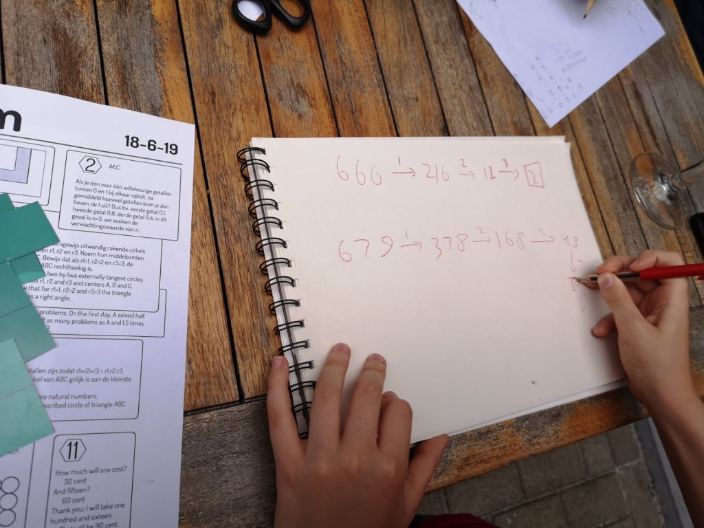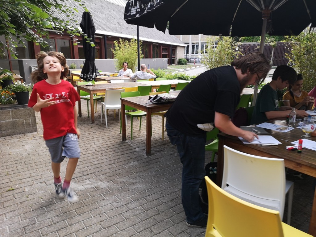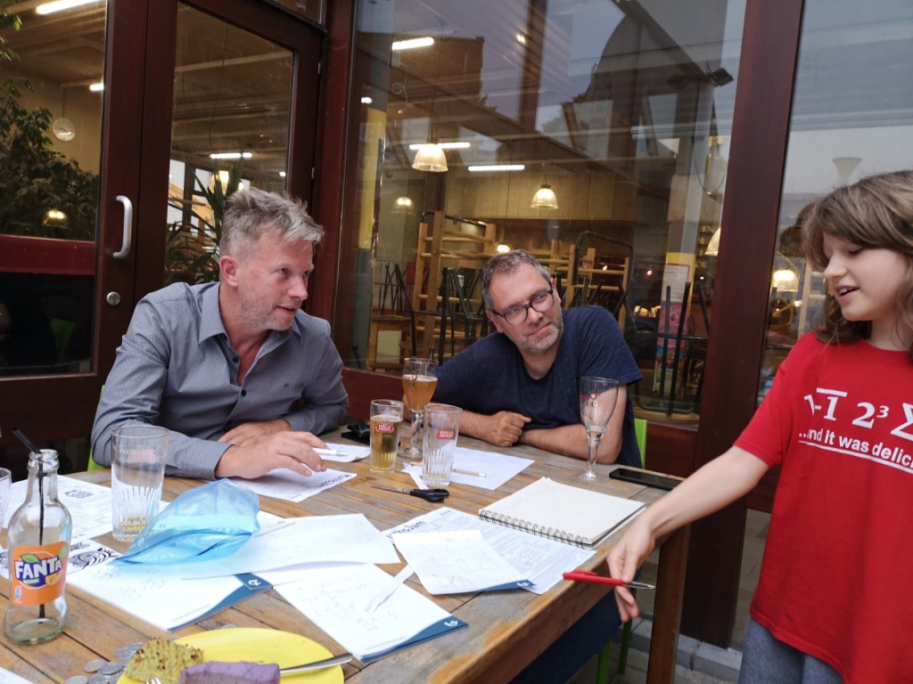 This was the last MathsJam this academic year and a very social one. Simon has enjoyed the outside setting and mingled with the other mathematicians. Simon had also contributed two problems (numbers 3 and 5). Unfortunately we haven’t seen anyone solve them (the problems come from the Russian math olympiad published in the magazine Kvantik).Simon had recognized two problems he knew the answers to. Here he is explaining the persistences problem (number 13). The smallest number with persistence 5 is 679Simon trying to prove that the solution to problem number 2 is e.