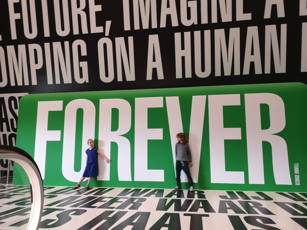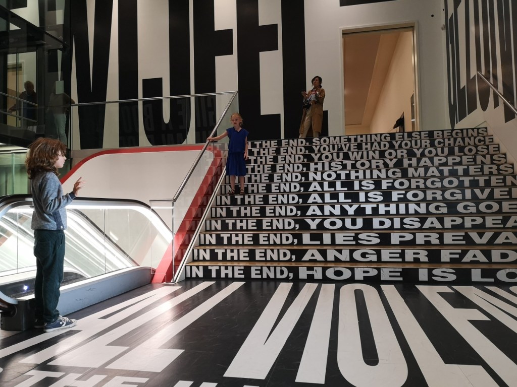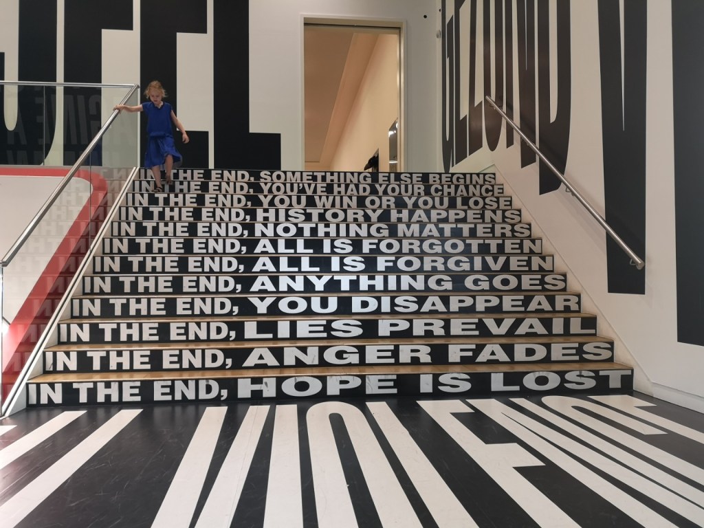 As for Morellet’s RGB colored cells, very inspiring for a sandpiles coding project. (The photographs don’t convey half of the effect the original canvasses invoke. Morellet’s cells actually appear to be moving when you gaze at the original).Installation by Barbara KrugerInstallation by Barbara KrugerRead this poem from top to bottom and it’s depressing, from bottom to top and it’s empowering.