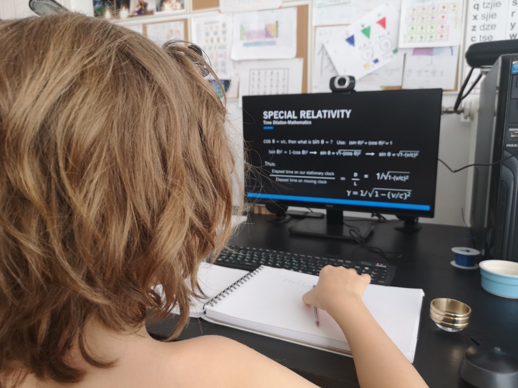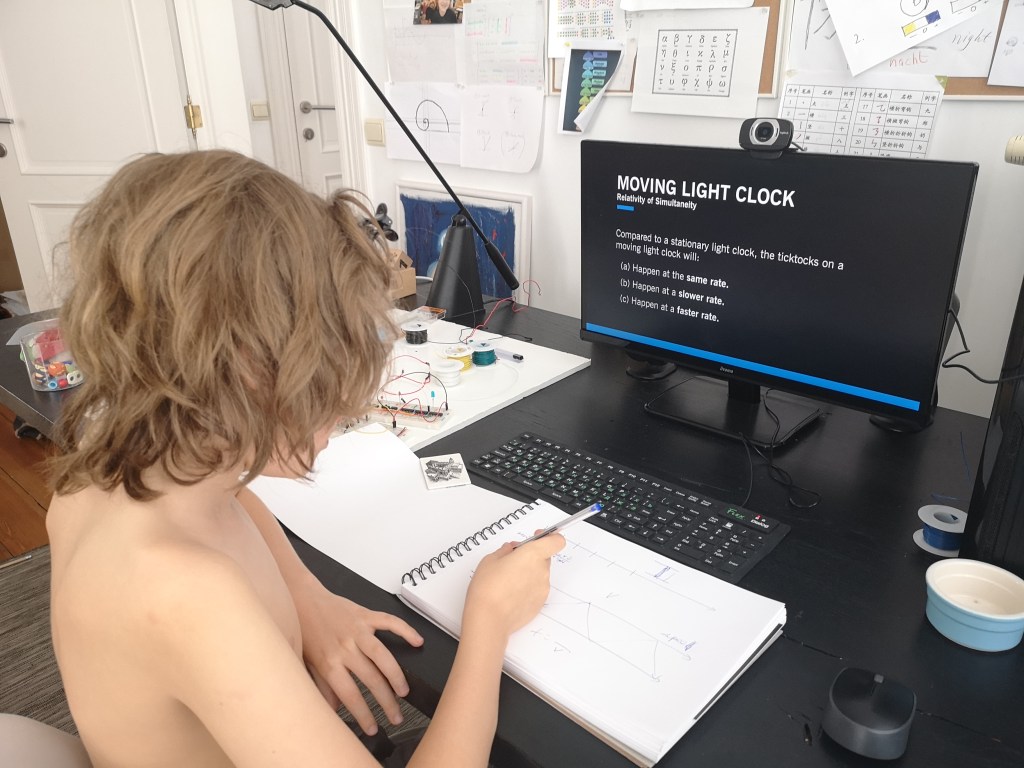 Throughout the program, the students are given access to over a dozen unique interdisciplinary online courses and have the option to complete an applied math project, alone or as a team, consulting real experts in the field of their project. Simon has already started the first course module, on Special Relativity by Professor Brian Greene. The course has been specifically recorded for the World Science Scholars and reflects the program’s ethos: it’s self-paced, no grades, it relies on beautiful animations and visualizations, it’s full of subtle humour, is dynamic, thought-provoking and quite advanced (exactly in The Goldilocks Zone for Simon, as far as I could judge), yet broken up into easy-to-digest pieces. It’s difficult to predict how Simon’s path as a World Science Scholar will unfold (I’m afraid of making any predictions as he is extremely autodidact), but so far we have been very pleased with the nature of this program and it seems to match our non-coercive, self-directed learning style. I have especially liked one of the course’s main postulates: “Simultaneity is in the eye of the beholder”.