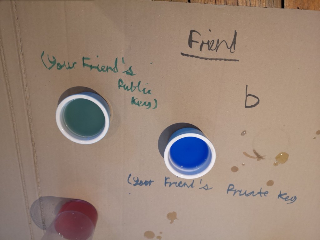 This is Simon explaining Diffe-Hellman key exchange (also called DiffeHellman protocol). He first explained the algorithm mixing watercolours (a color representing a key/ number) and then mathematically. The algorithm allows two parties (marked “you” and “your friend” in Simon’s diagram) with no prior knowledge of each other to establish a shared secret key over an insecure channel (a public area or an “eavesdropper”). This key can then be used to encrypt subsequent communications using a symmetric keycipher. Simon calls it “a neat algorithm”). Later the same night, he also gave me a lecture on a similar but more complicated algorithm called the RSA. Simon first learned about this on Computerphile and then also saw a video about the topic on MajorPrep. And here is another MajorPrep video on modular arithmetic.