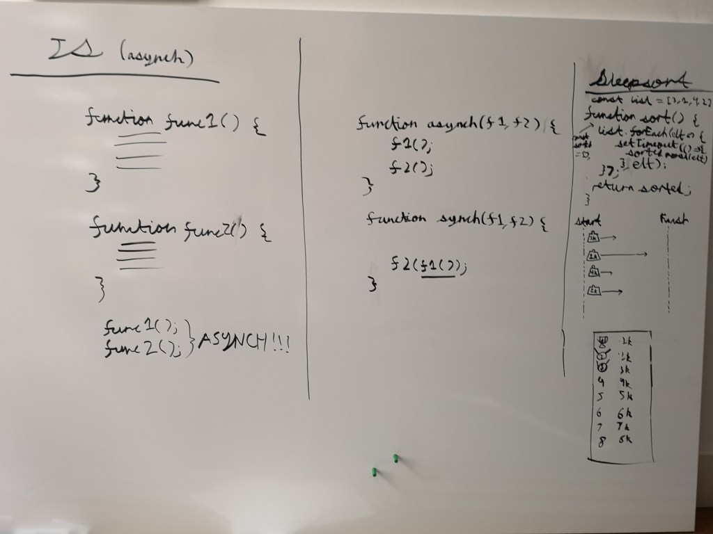 Simon thinking about how to turn an asynchronous language into a synchronous language, using Sleepsort as a test.