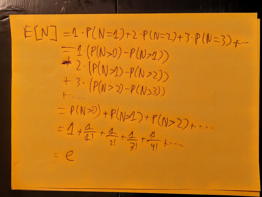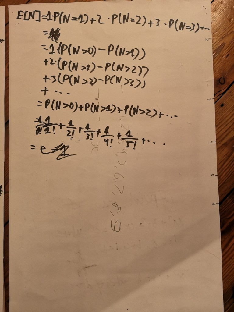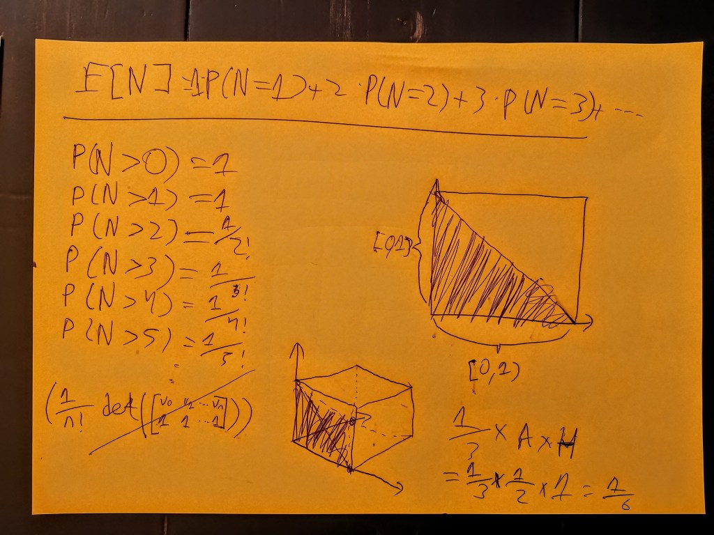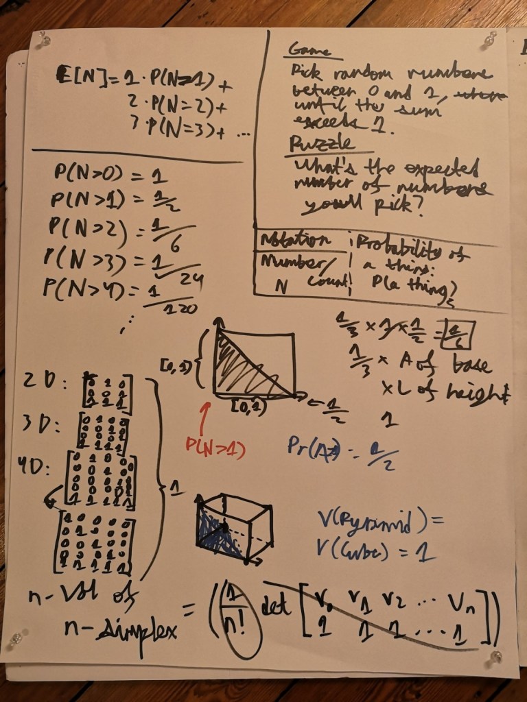 Today, Simon returned to a problem he first encountered at a MathsJam in summer: “Pick random numbers between 0 and 1, until the sum exceeds 1. What is the expected number of numbers you’ll pick?” Back in June, Simon already knew the answer was e, but his attempt to prove it didn’t quite work back then. Today, he managed to prove his answer!