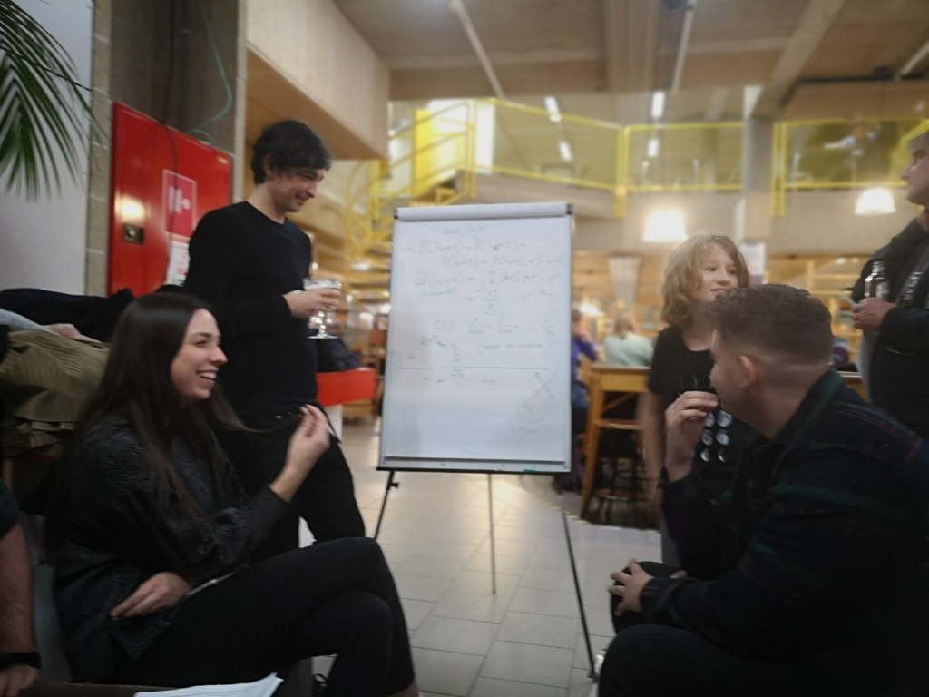 Later the same evening, Simon had a blast demonstrating the proof to a similar problem to a larger grateful and patient audience, including Professor David Eelbode. The first proof was Simon’s own, the second problem (puzzle with a shrinking bullseye) and proof came from Grant Sanderson (3Blue1Brown) on Numberphile.