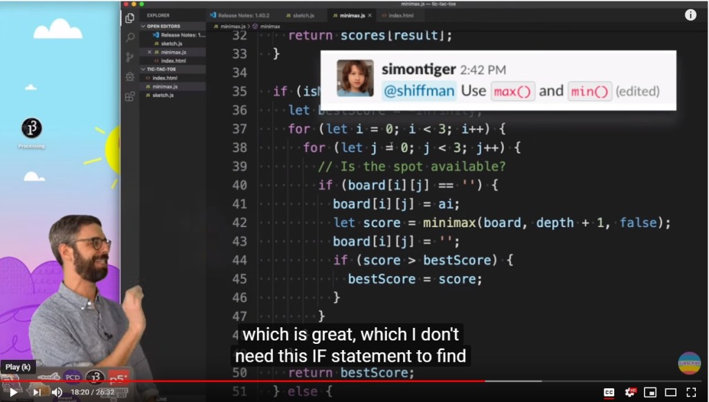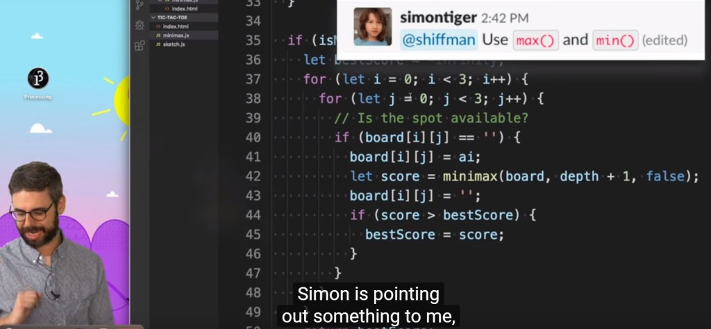 Every live session Daniel Shiffman mentions Simon several times, usually because Simon gives good feedback/ advice. On the other end, Simon is invigorated and jumping about the room. Sometimes resulting in serious bumps against the furniture.