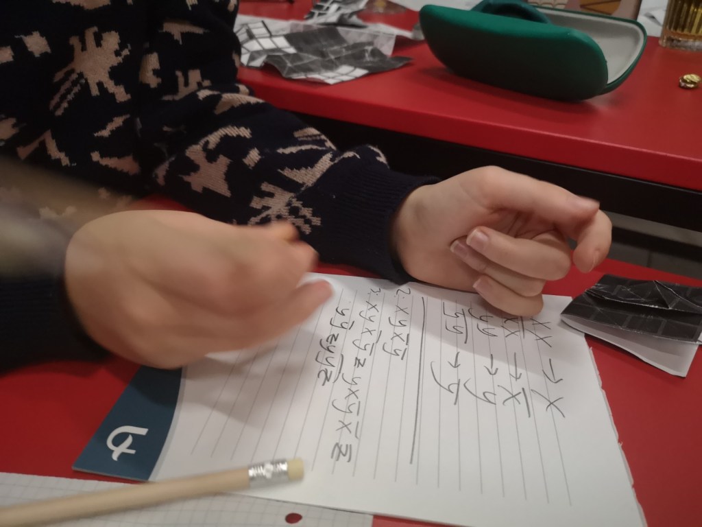 Simon had a wonderful time at MathsJam Antwerp again. One of the problems was something he was already familiar with – the puzzle about hanging a painting using two pegs so that it would definitely fall if one removes any of the two pegs. He explained the way to solve this problem in an abstract way (turning pegs into strings, using knot theory and compiling the algorithm). Later the same evening, he developed a new algorithm to solve the same problem for three pegs and successfully demonstrated the result on his own shoe laces. His solution was the most efficient/ elegant in the group and his enthusiasm was very catchy, the audience said.