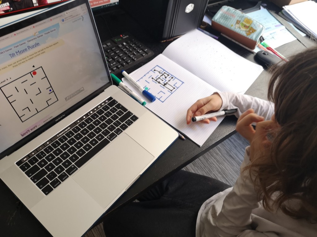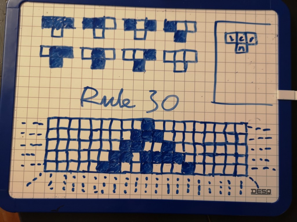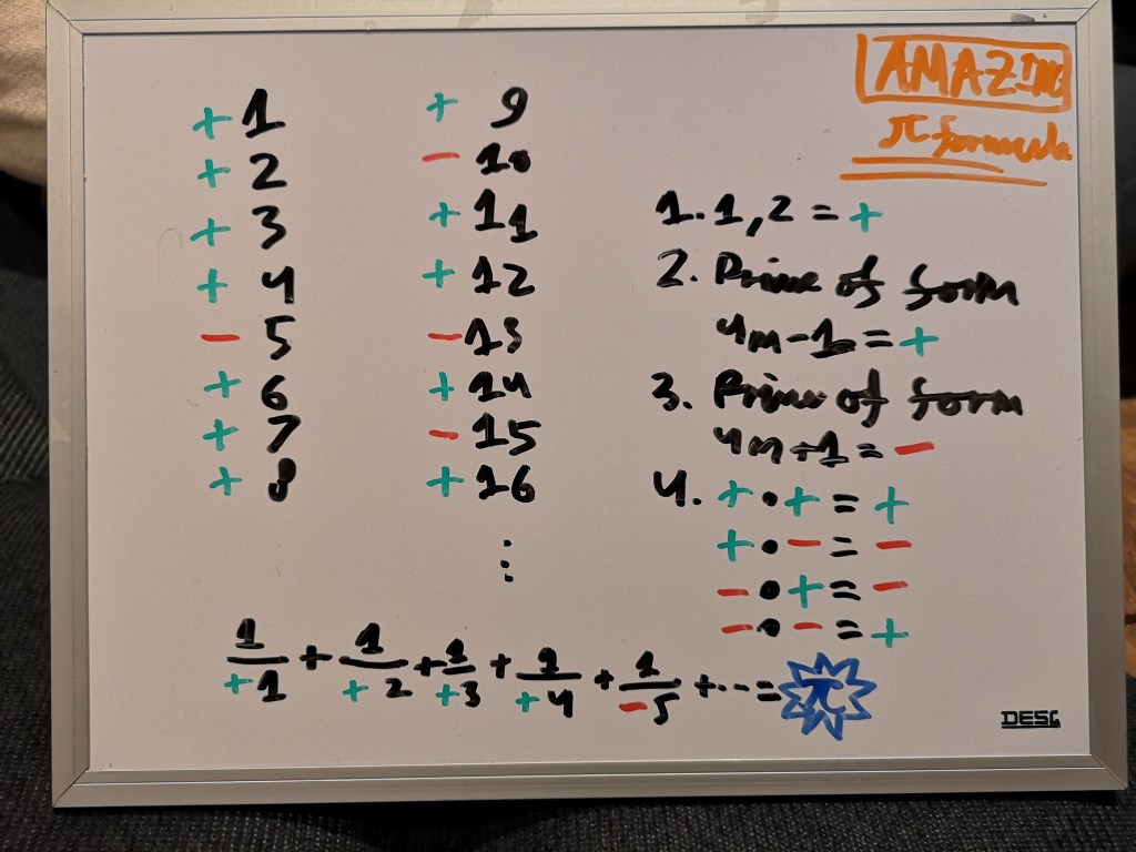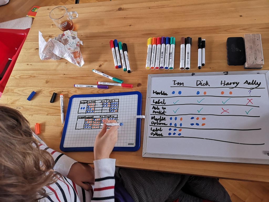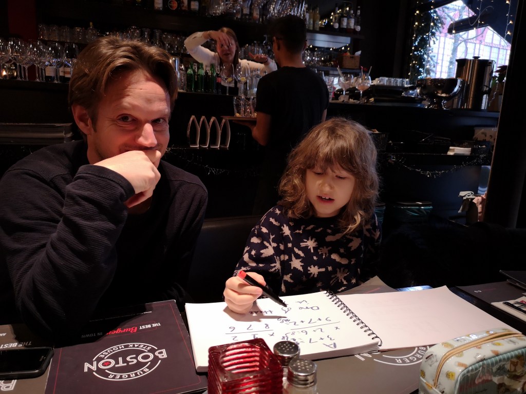 a math trick based on probability and proof (presented to me while putting his pyjamas on one December evening)the first thing he wrote on his new mini-whiteboard after getting it for Sinterklaaswhile reading Stephen Wolfram’s A New Kind of Sciencearea of a hexagonfinding proof for puzzle solutiongenerally doing a lot of math with his little sister, like calcdocus in this pictureteaching mathematical concepts and solving problems to entertain family and friends