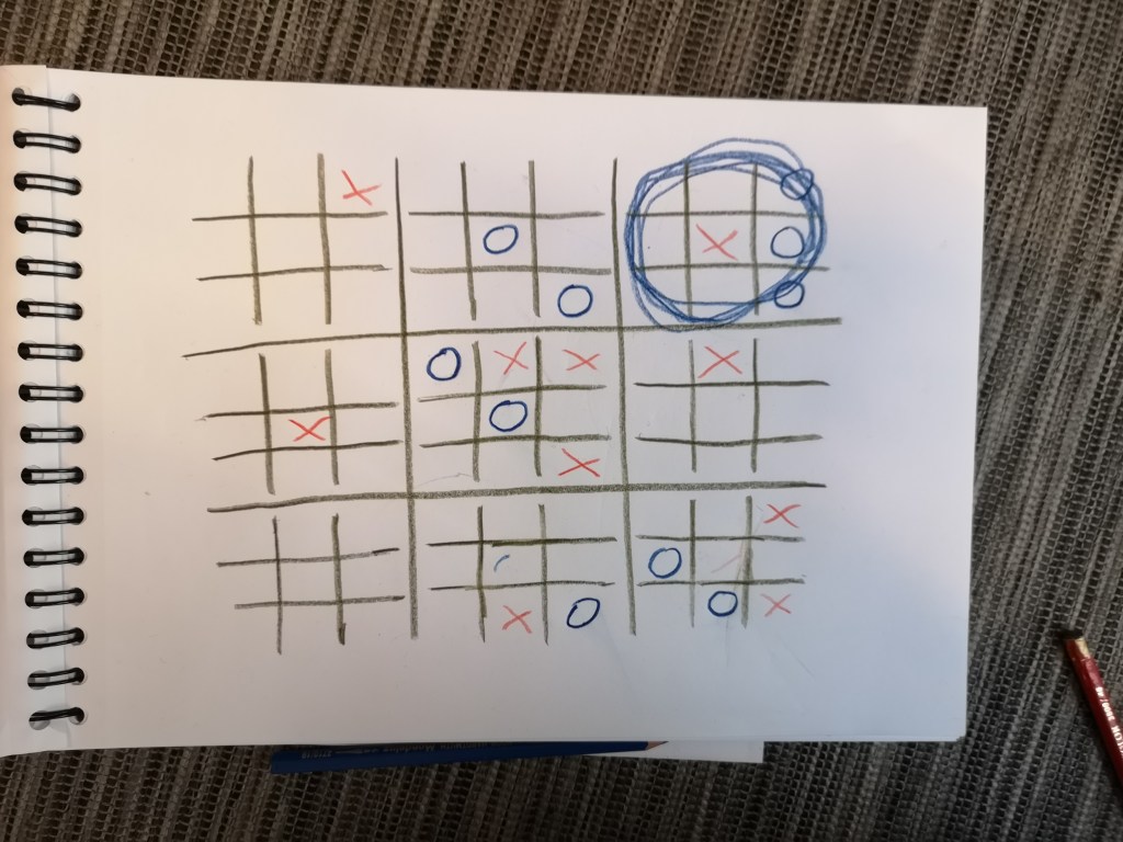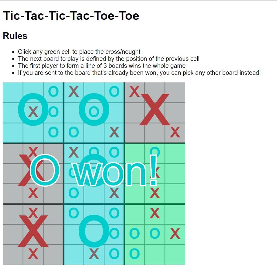 Simon has programmed this game of Tic-Tac-Tic-Tac-Toe-Toe Game in p5.js from scratch. He and his sister have had hours of fun playing it (and she turned out to be better at this strategic game):