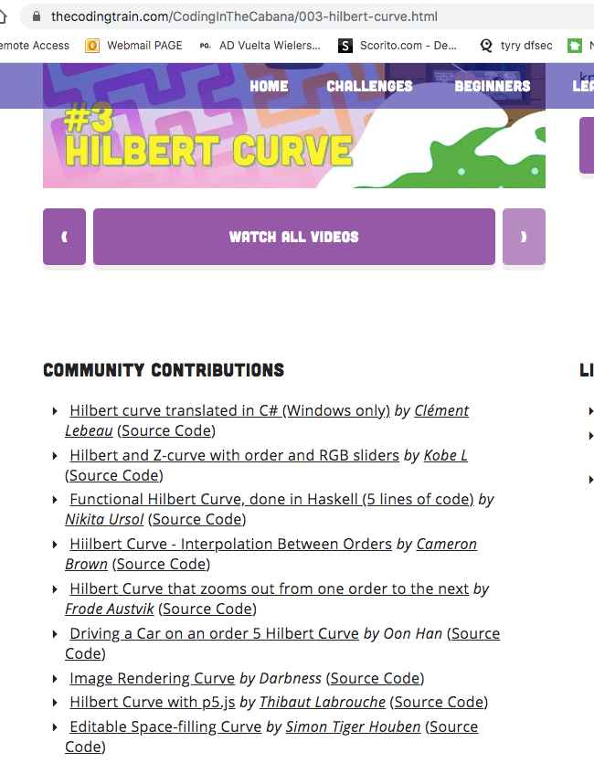Simon prepared this project as a community contribution for The Coding Train (Simon came up with his own way to draw the Hilbert Curve and added interactive elements to enable the user to create other colourful space-filling curves (Hilbert Curve, Z-order Curve, Peano Curve and more!). You can see Daniel Shiffman’s Hilbert Curve tutorial and coding challenge on The Coding Train’s website (including a link to Simon’s contribution) via this link: https://thecodingtrain.com/CodingInTheCabana/003-hilbert-curve.html