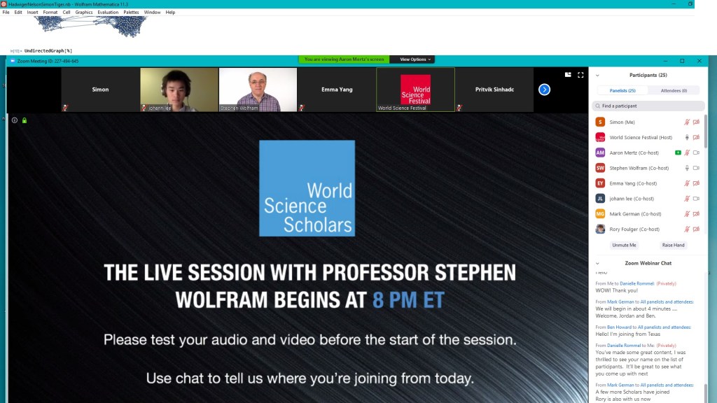 At the live session, a few scholars including Simon were planning to present their Wolfram Language demos, but Professor Wolfram was so inspired by his current research that he decided to share his latest discoveries instead (he is tiptoeing closer to laying the foundations of a theory that would unify all natural sciences based on his principle of computational equivalence). It was a very engaging session (even though Simon’s video camera malfunctioned, which hardly mattered).