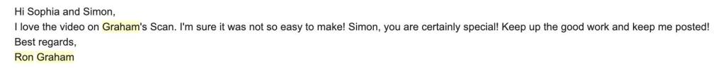 Simon and I are shocked to hear that 2020 has taken the life of yet another math giant, and one of the kindest of them all. Something we will now cherish forever, the little e-mail Ron Graham took the time to send Simon a year ago: