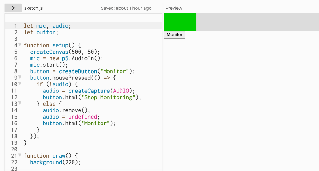 Simon has created this sound monitor to help him keep track of the sounds around him if he has his headset on. You can hear the surrounding sounds much better via pressing the “Monitor” button and stop listening to your surroundings by pressing “Stop Monitoring”: https://editor.p5js.org/simontiger/sketches/5TIWPuZW6