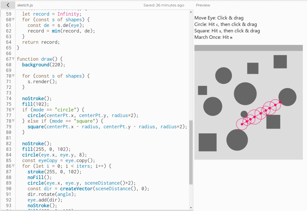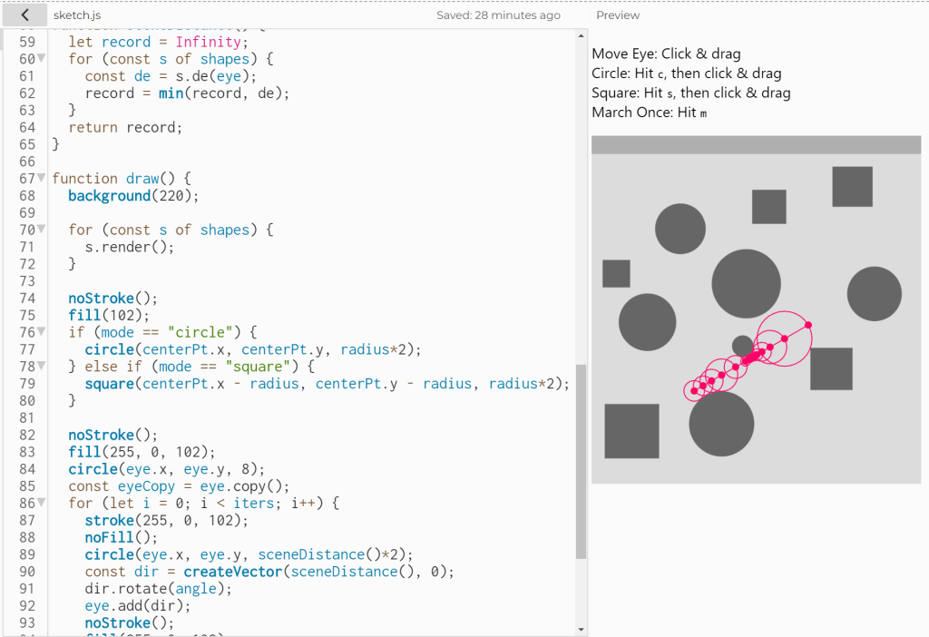 “That’s a most unusual technique that’s used for that. Normally you would use rasterization”, Simon explains. What on earth is that? Rasterization simply means taking an image described in a vector graphics format and converting it into a raster image, i.e. a series of pixels, dots or lines. But Simon doesn’t use rasterization. He uses ray marching. So what is ray marching?