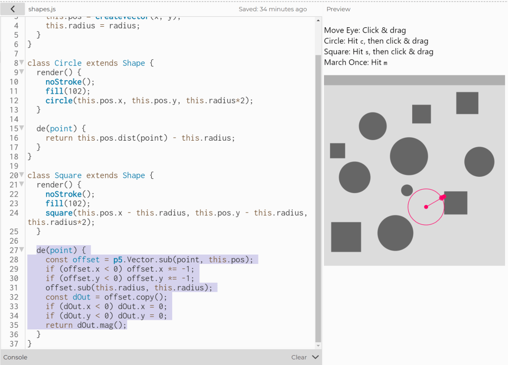 “Ray marching is an algorithm to shoot a ray until it hits the scene. Normally it’s done with ray tracing, but ray marching gives us extra possibilities”.