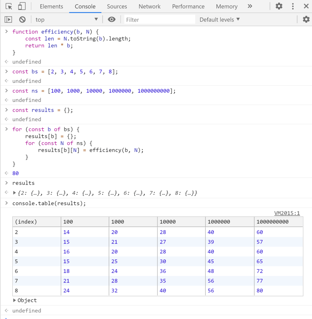 I defined the efficiency function in JS, I turned the crank and I got this table. So what this is is the efficiency in bases 2 through 8 for the numbers 100, 1000, 10 000, 1 000 000 and 1 000 000 000.