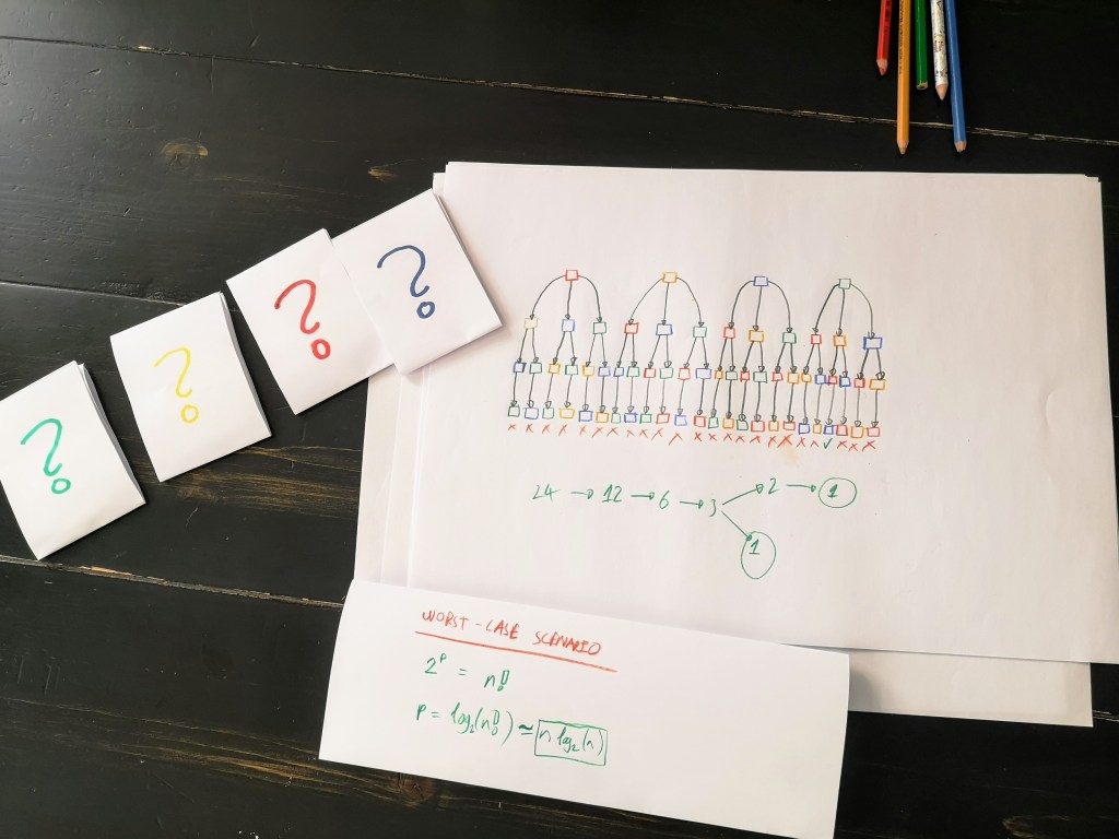 Simon showed us this guessing game where we had to guess the correct sequence of cards with numbers 1, 2, 3, 4 while the cards are all flipped upside down. It sound like a simple little thing but it has deep implications for understanding how sorting algorithms work.