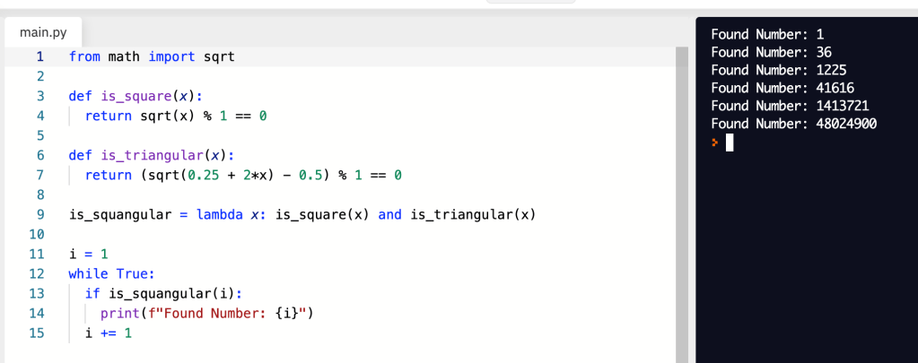 Squangular numbers are rare, like the next squangular number is 1225. The next one is 41616, then 1413271, then 48024900, and after that I didn’t bother checking.